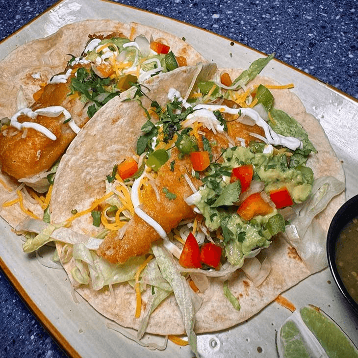 2 flour tortillas topped with our Corona beer-battered cod fish, with lettuce, pico de gallo, cheese, guacamole, & sour cream