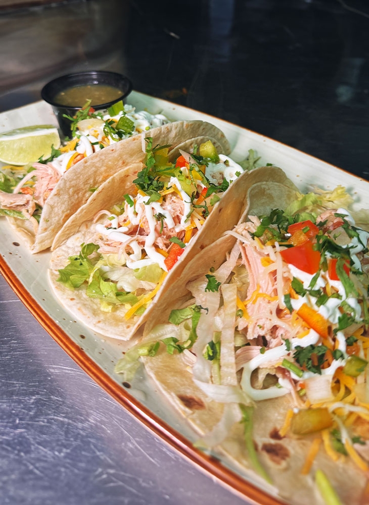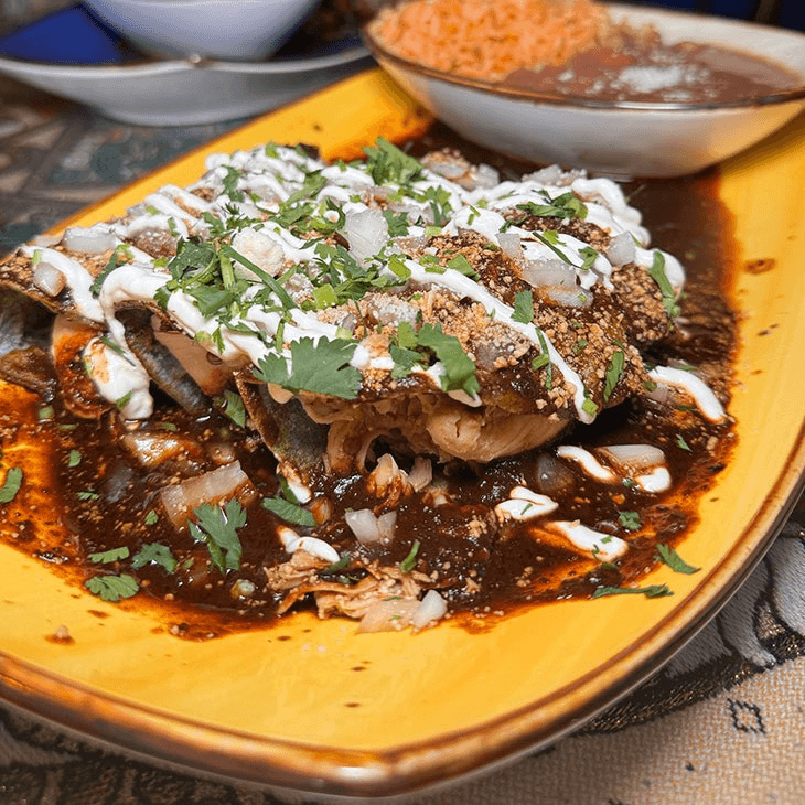 3 folded corn tortillas stuffed with pulled chicken. Choice of sauce: mole, salsa verde, creamy chipotle, or non-spicy red sauce. Topped with cotija cheese, sour cream, onion, & cilantro. Served with rice & beans