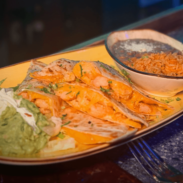 10" pulled chicken or ground beef with cheese. Topped with red tomato sauce. Served with rice & pinto beans, garnished with lettuce, pico de gallo, guacamole, & sour cream
