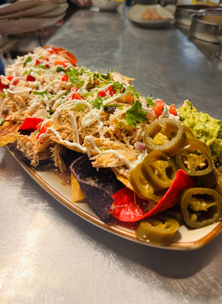 A bed of beans topped with corn tortilla chips. Served with cheese, pico de gallo, jalapeño peppers, guacamole, & sour cream