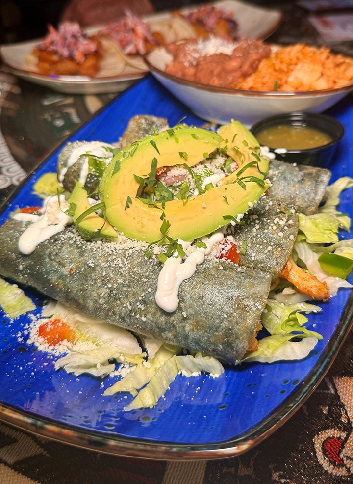 3 folded corn tortillas stuffed with spinach, cactus, mushrooms, corn, tomatoes, peppers, and onions. Choice of sauce: mole, salsa verde, creamy chipotle, or non-spicy red sauce. Topped with onion & cilantro. Served with rice & beans