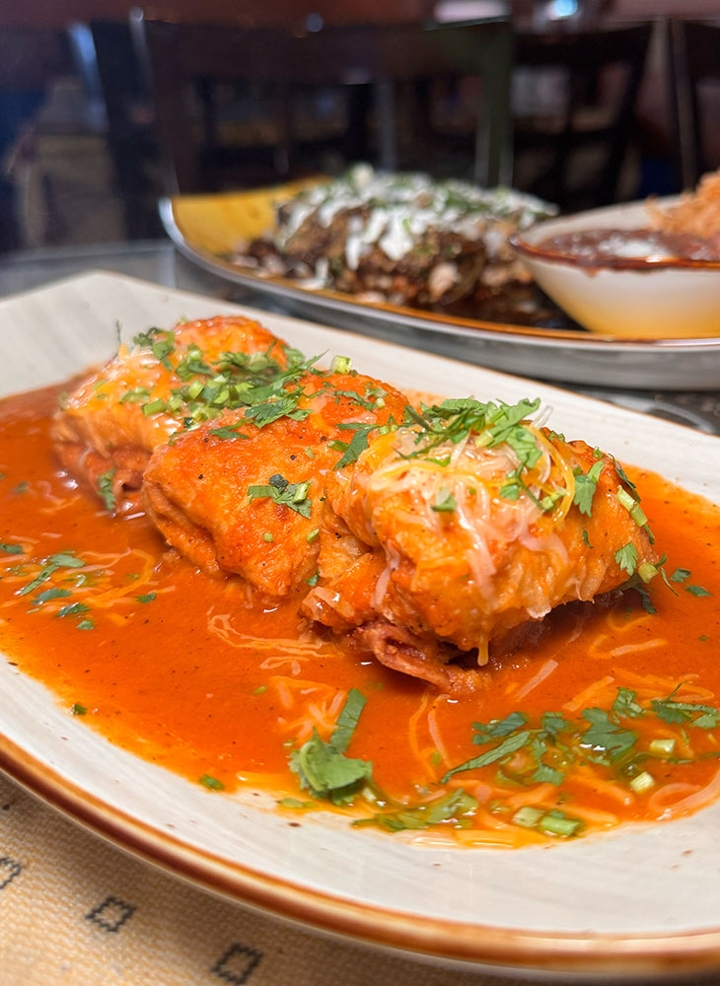10" soft flour tortilla pocket stuffed with pork, covered with guajillo pepper sauce. Served with rice & pinto beans, garnished with lettuce, pico de gallo, guacamole, & sour cream