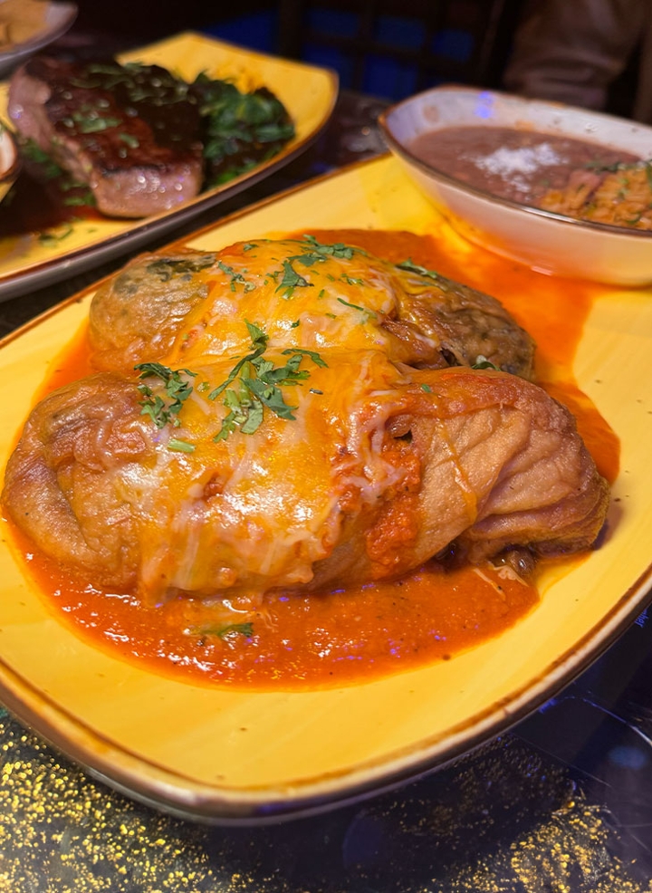 Pulled chicken or ground beef with cheese, deep-fried. Topped with red tomato sauce. Served with rice & pinto beans, garnished with lettuce, pico de gallo, guacamole, & sour cream