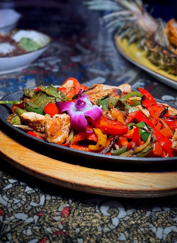 9 oz of grilled chicken or steak with sautéed cactus, peppers, & onions. Served with 3 soft flour tortillas, rice, and pinto beans, garnished with lettuce, pico de gallo, guacamole, & sour cream